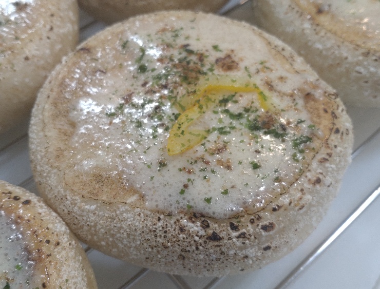 低温の乾燥焼きでメロン皮をサクサクにし、もっちり生地と絶妙なコントラストにした一品。ふつうのメロンパンだと思ってハードルを下げて、お召し上がり頂ければ、とても美味しく感じます。